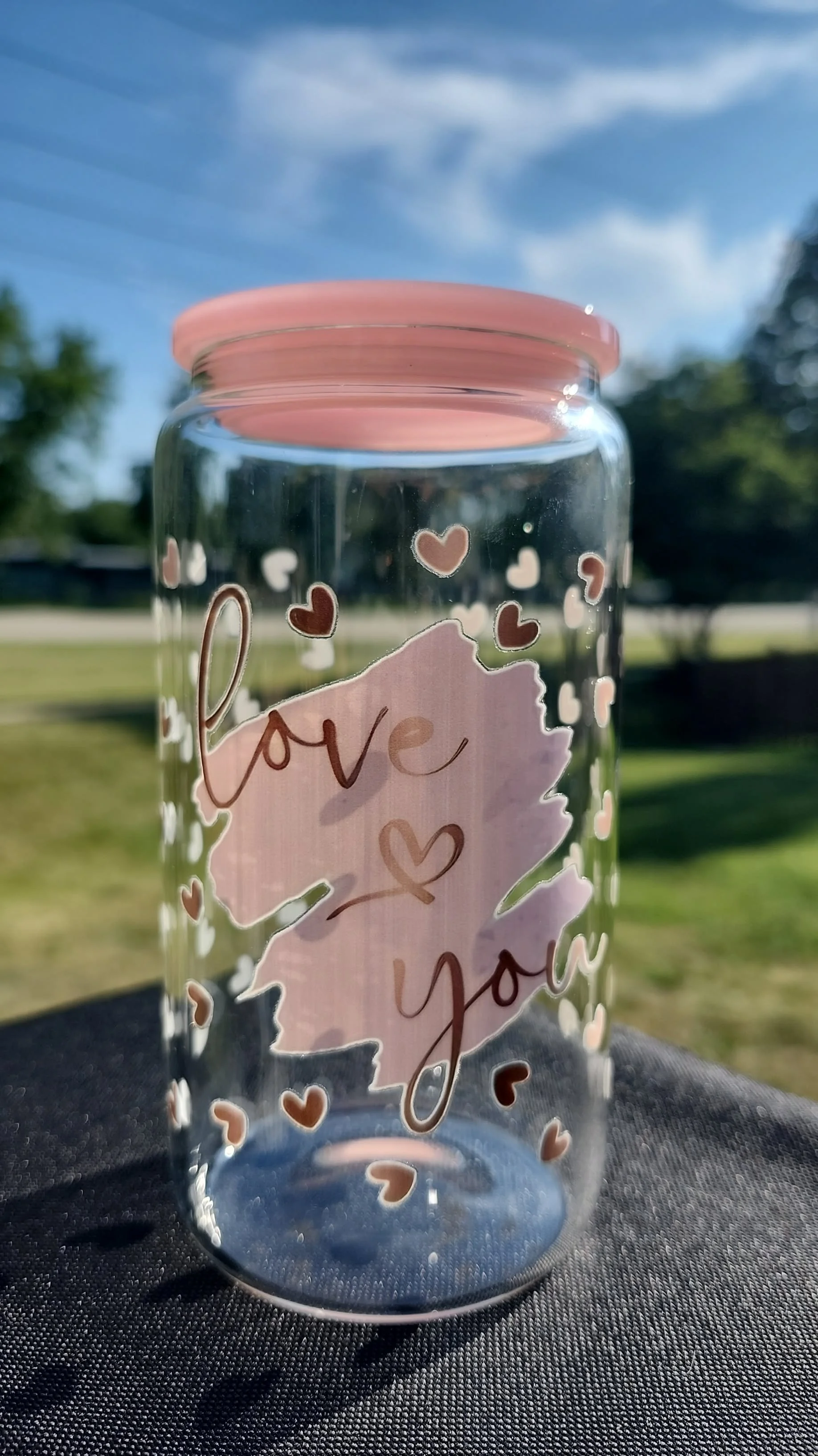 Shop › PInk glass jar PInk glass jar $15.00 I love you glass jar with plastic pink lid with a glass straw 16oz I love you glass jar with plastic pink lid with a glass straw 16oz Quantity: Add To Cart Added!